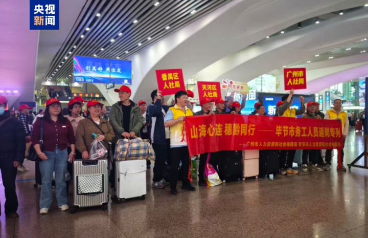 记者从国铁广州局了解到,2月25日13时53分,D1853次列车缓缓驶入广州南站,1200余名毕节籍务工人员拎起行李,前往工作岗位。这是黔粤两地人社部门、工会联合国铁广州局组织的首趟“山海心连穗黔同行”返岗专列。