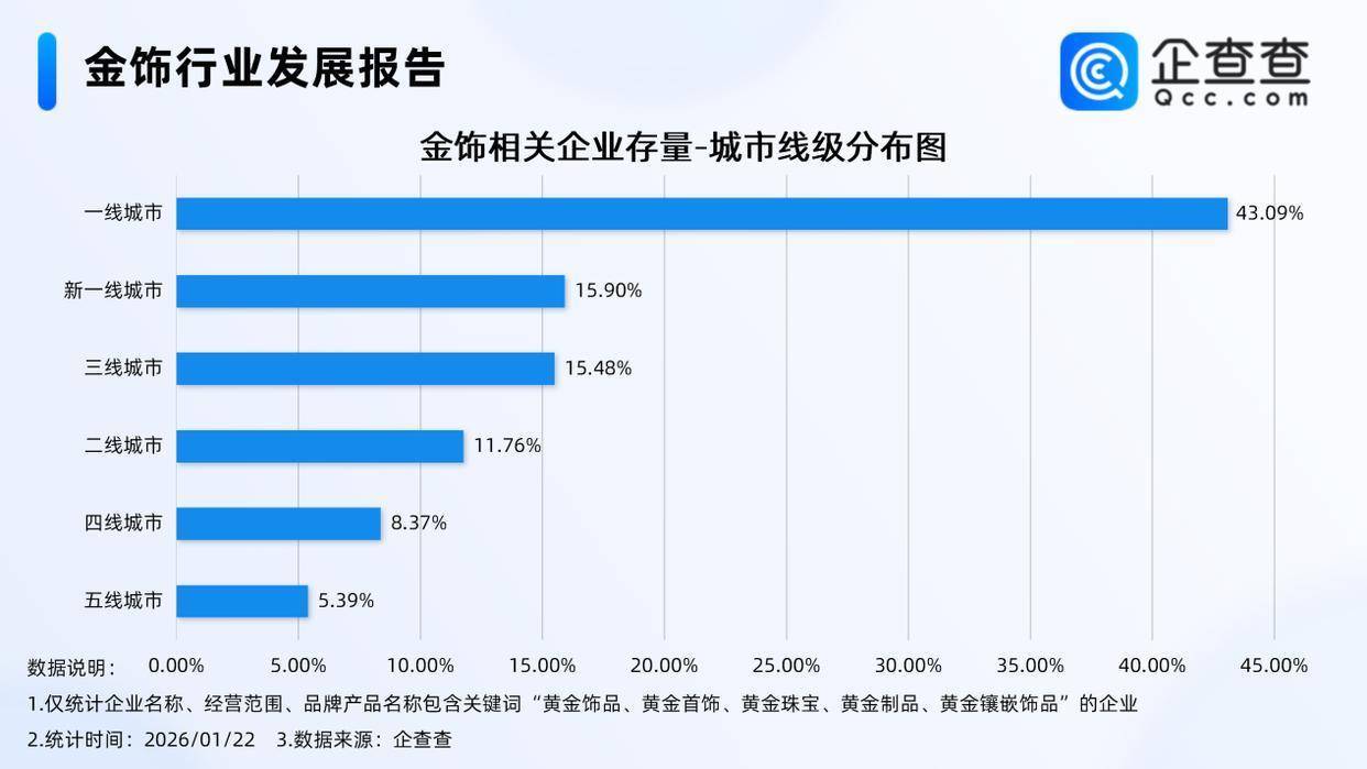 企查查数据显示,截至1月22日,国内现存金饰相关企业6.24万家。从经营时间来看,现存金饰相关企业大多为老牌企业,成立年限在5年以上的相关企业占比超七成。从注册资本来看,金饰相关企业多为轻量级企业,注册资本在100万元以内的相关企业占比39.78%。从城市线级分布来看,金饰相关企业多分布在一线城市,占比达43.09%。注册量方面,2025年全年注册3901家金饰相关企业,截至目前,今年已注册186家。