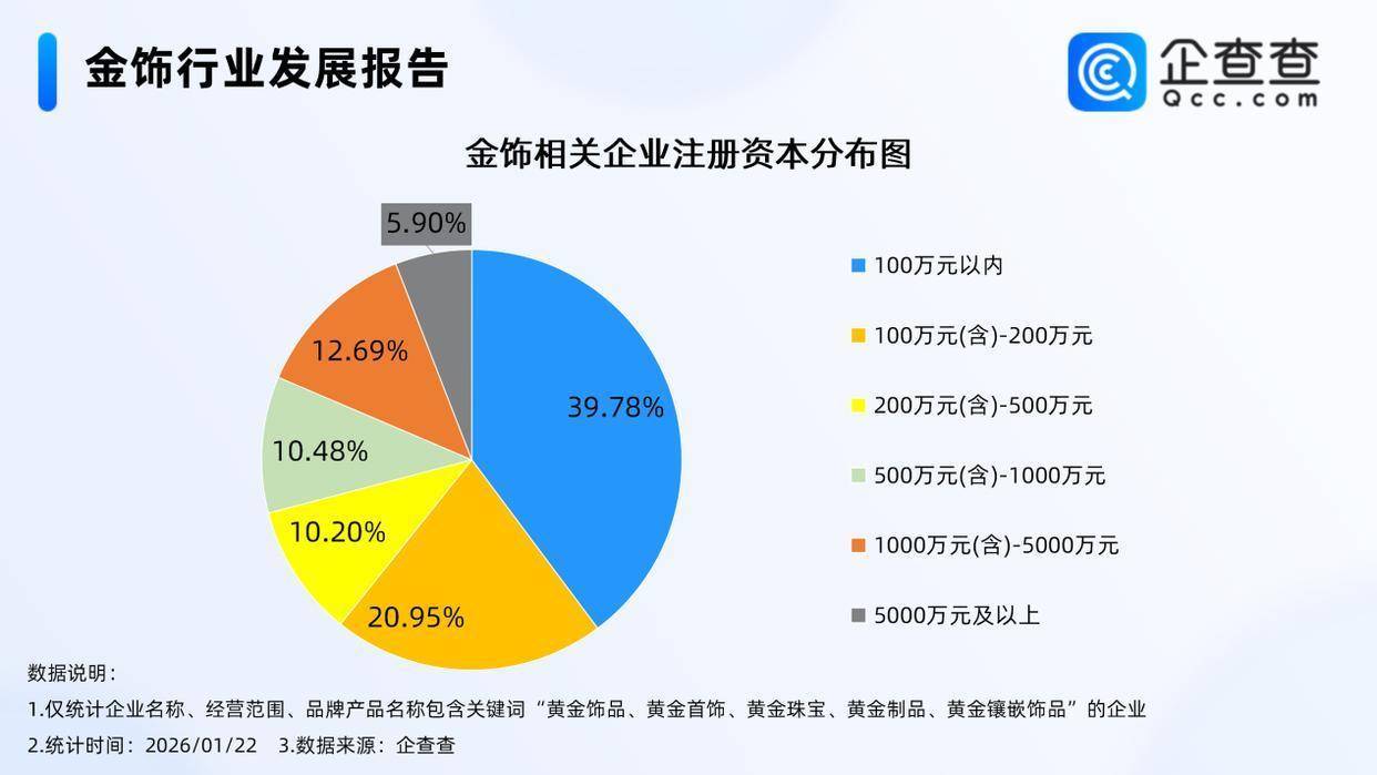 企查查数据显示,从注册资本来看,金饰相关企业多为轻量级企业,注册资本在100万元以内的相关企业占比39.78%,在100万元(含)-200万元的相关企业占比20.95%。此外,注册资本千万级的金饰相关企业合计占比18.59%。